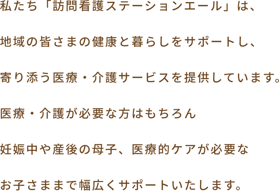 私たち「訪問看護ステーションエール」は、地域の皆さまの健康と暮らしをサポートし、寄り添う医療・介護サービスを提供しています。